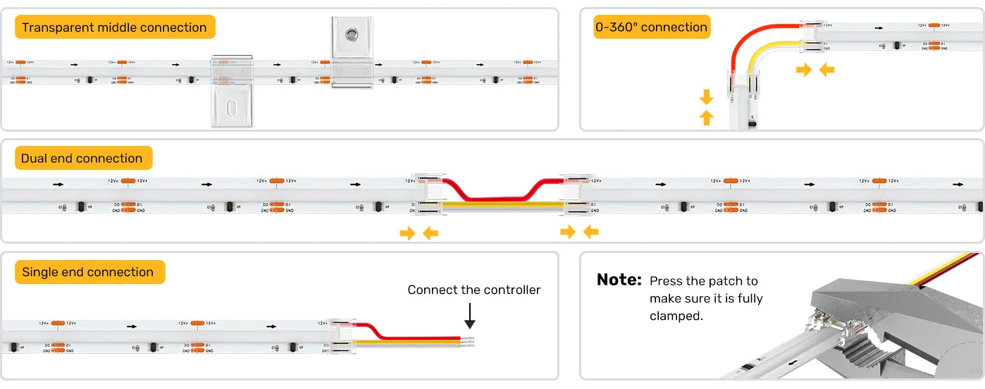 3. Heat management: COB light strips emit dense light and generate heat when running at high power. It is recommended that the light strips be affixed to aluminum profile slots. The aluminum slots not only provide a professional light output (like a lens), but more importantly, they also play a crucial role in heat dissipation, effectively extending the life of the light strip.