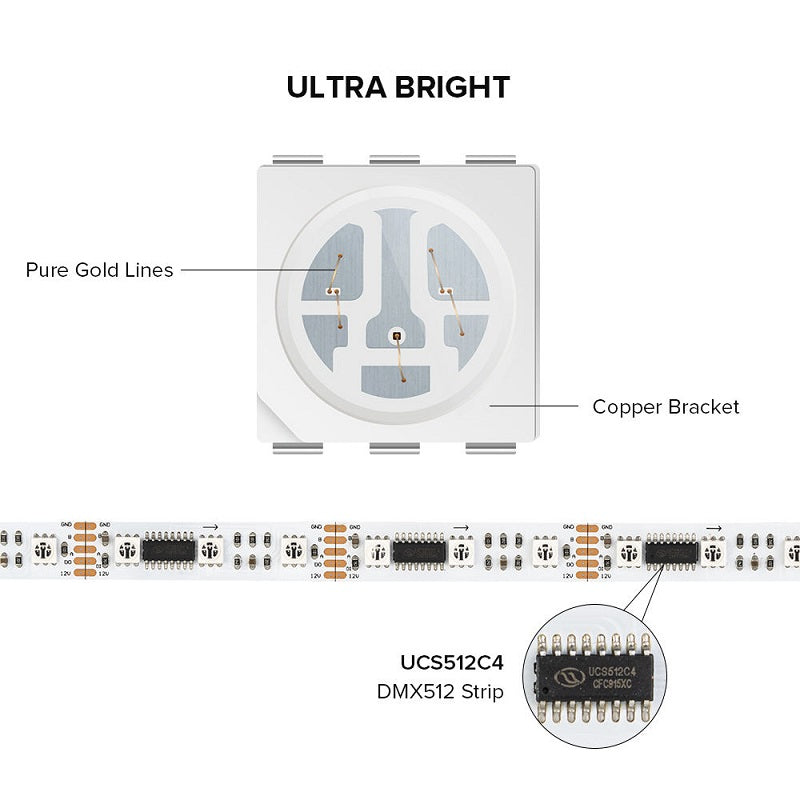 The UCS512C4 LED strip uses the DMX512 protocol for control (differential RS-485 TTL), meaning it cannot be directly driven by an SPI controller (such as an Arduino WLED controller) like a standard WS2812 – you will need a DMX controller/decoder to send signals.